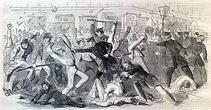 - Émeutes génèrées par l'incorporation dans les villes du Nord. Les Blancs pauvres s'en prennent aux Noirs qu'ils accusent d'être à l'origine de la guerre. À New York, les émeutiers attaquent le bureau de recrutement principal (13-16 juillet). Pendant trois jours, ils détruisent bâtiments, usines, tramways et domiciles des riches. Des Noirs sont assassinés. Les troupes de l'Union entrent dans la ville pour mettre fin aux émeutes qui ont fait 400 morts à peu près.